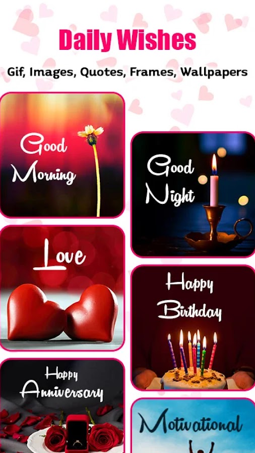 Начните делиться красивыми поздравлениями сегодня с помощью создателя поздравительных открыток и пожеланий доброго утра!Загрузите наше приложение Love Gif прямо сейчас и узнайте, как создавать и делиться красивыми поздравлениями. Будь то изображения с пожеланиями ко дню рождения или любовные цитаты и сообщения, в нашем приложении есть все, чтобы сделать ваши сообщения запоминающимися. Используйте «Создатель поздравительных открыток с фотографией», чтобы придать индивидуальность своим пожеланиям на день рождения, и поделитесь GIF-файлами ко Дню святого Валентина для текстовых сообщений, чтобы сделать сообщения более анимированными и выразительными. Начните свой день с позитивной ноты, используя картинки и поздравительные открытки с добрым утром. Начните немедленно и сделайте каждое поздравление запоминающимся с помощью этого приложения Love Gif!