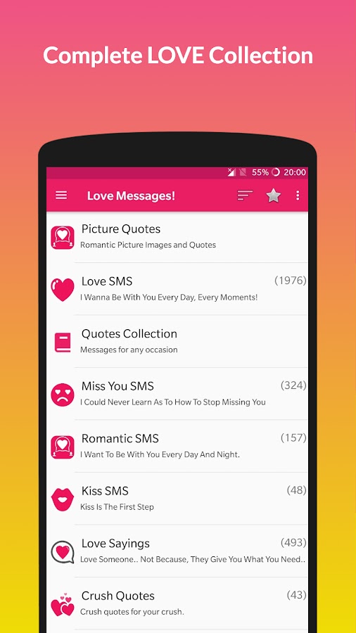 Лучшая коллекция сообщений о любви 🔥, красивых цитат, романтических обоев и цитат об отношениях с изображениями. Приложение Love экономит время и усилия, выбирая из наших организованных готовых трогательных сообщений. Загрузите последнюю коллекцию SMS 2020 в нескольких категориях. Стильный редактор текста для украшения вашего текста различными причудливыми символами и символами.