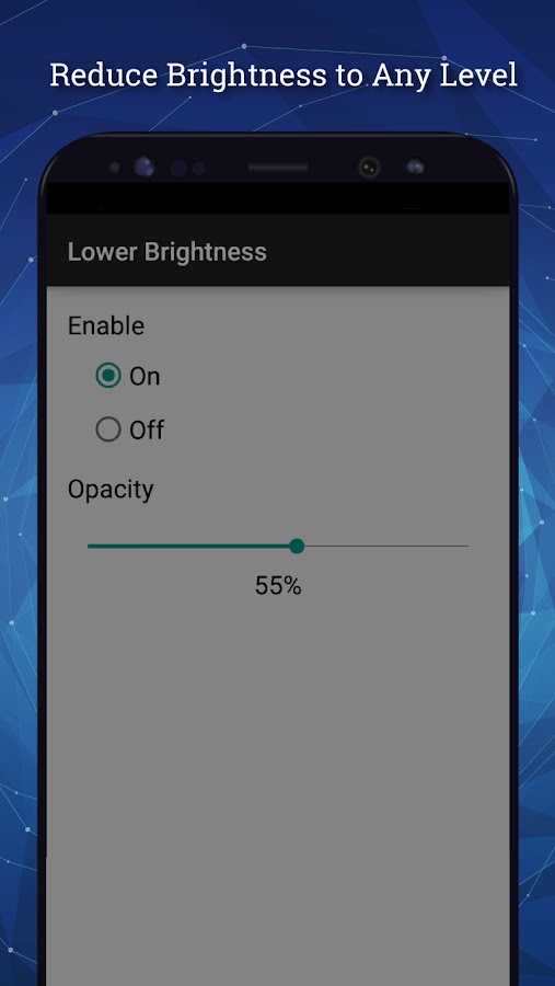 «Нижняя Яркость» приложение поможет вам снизить яркость до любого уровня. Вы можете установить уровень яркости от 0% до 100%, просто открыв приложение и выберите уровень яркости вы хотите.