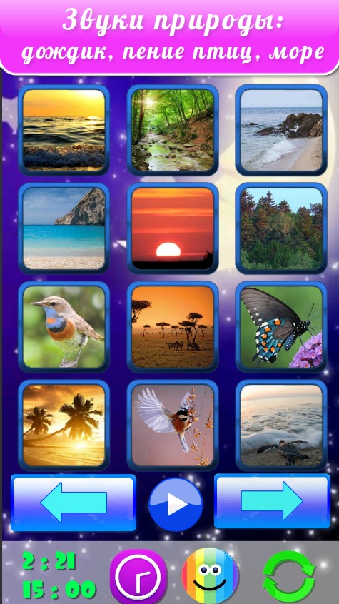 Похож на детский телефон, на экране изображены картинки из колыбельных, есть 3 раздела: детские песни для сна, классическая музыка, звуки природы.