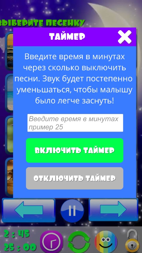 Есть таймер для сна, который поможет уснуть Вашему ребенку быстро. Вы выставляете время через сколько минут отключить музыку для сна, звук будет плавна уменьшаться! Песни для малышей, очень быстро убаюкивают малыша, окружают его любовью и за