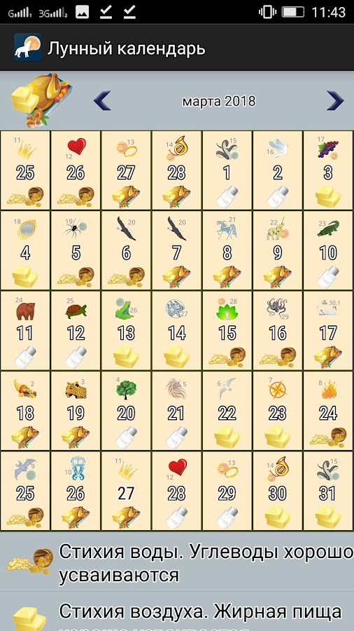 Этот календарь содержит интуитивно понятные изображения, нажав на которые Вы увидите соответствующие советы. Стоит ли сегодня делать стрижку или, может быть, лучше сделать эпиляцию? Каждый день Вы будете получать ответы на эти вопросы с помощью нашего приложения.