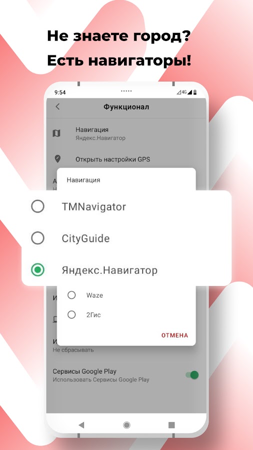 Приложение найдет дорогу до клиента даже оффлайн с помощью встроенных навигационных систем TMNavigator, и дополнительных: Яндекс.Навигатор, Google Maps, 2GIS и др. Также в приложение встроен спутниковый таксометр.