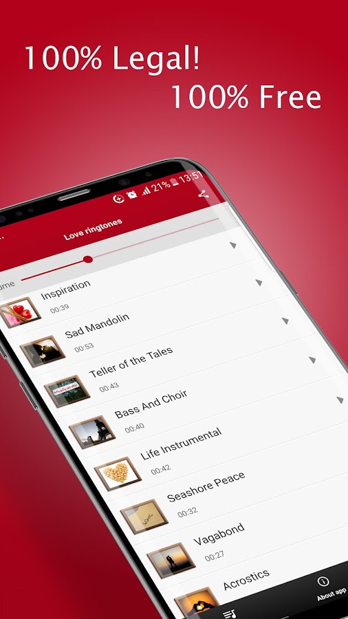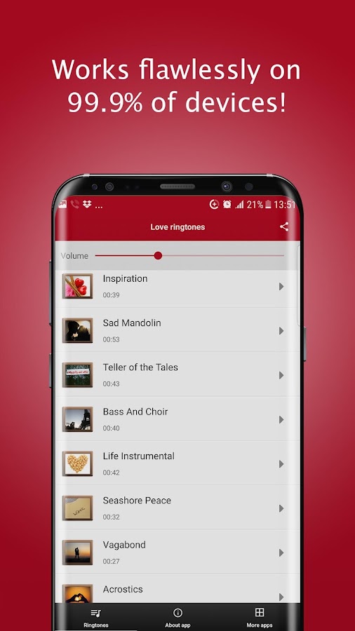 Лучшие песни о любви в вашем распоряжении, и вы можете установить самую любимую романтическую песню в качестве рингтона или установить романтический смс сообщения на телефон. Установите романтический сигнал для sms и чувствуйте любовь каждый раз, когда вы получите сообщение от вашей второй половинки. Вы также можете использовать романтические любовные рингтоны, бесплатные классные рингтоны на телефон.
