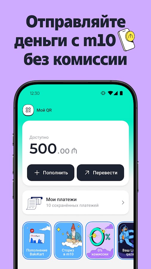 • Мгновенные переводы другим пользователям m10 без комиссии