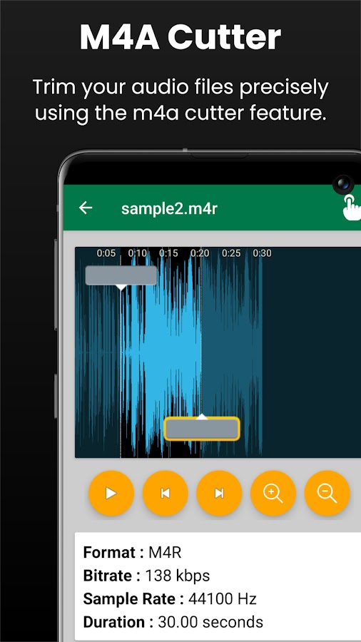 Точно обрезайте аудиофайлы с помощью функции M4A Cutter. Выберите определенное время начала и окончания, чтобы создавать собственные мелодии звонка, уведомления или более короткие клипы для совместного использования.