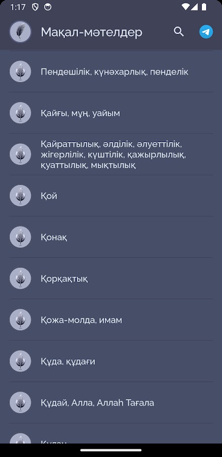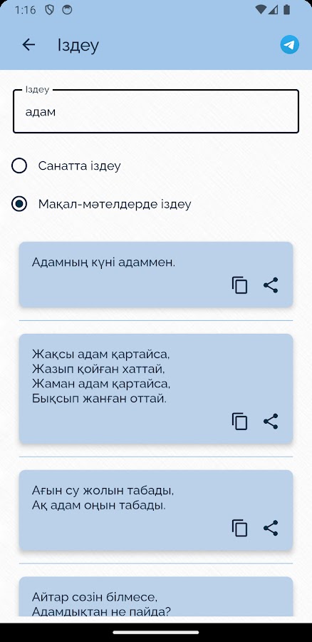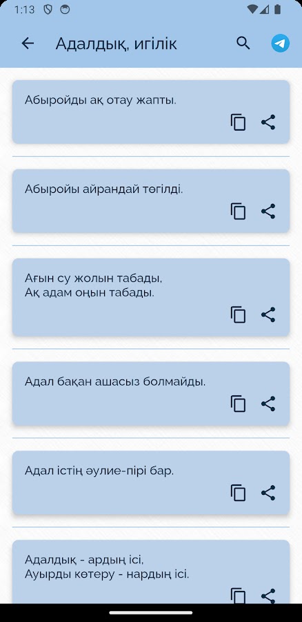 С помощью приложения «Коллекция пословиц» вы сможете систематически изучать это богатое наследие. Кроме того, он содержит казахские пословицы, которые вы можете использовать в повседневной беседе и помогает глубже понять их смысл. Добавка улучшает ваши разговорные навыки и расширяет мышление.