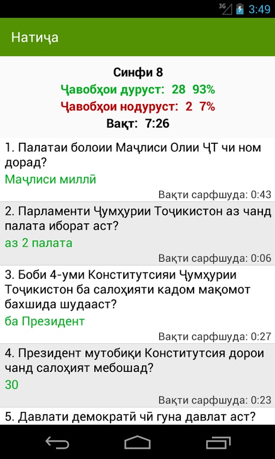 Пас аз анҷоми тест, Шумо метавонед натиҷаҳои ҷавобҳои худро бинед. Натиҷаҳо ба таври автоматӣ сабт мешаванд, то ин ки Шумо тавонед пешравии худро назорат намоед. Дар барнома ду намуд саволҳои тестӣ мавҷуд аст: