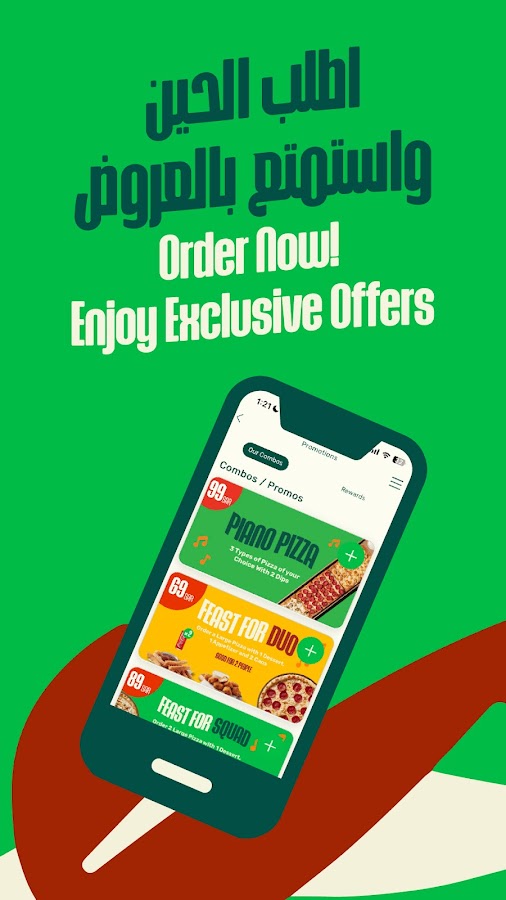 с широким выбором вариантов на выбор, включая закуски и десерты. Мы также предлагаем эксклюзивный раздел «Акции» и коды скидок, доставляемые через уведомления, чтобы помочь вам сэкономить на ваших заказах. Независимо от того, предпочитаете ли вы доставку или самовывоз, мы мы вас прикрыли. Наше приложение предлагает два удобных варианта заказа: доставить пиццу прямо к вам в течение 30 минут или забрать ее из одного из наших филиалов или даже из окна вашего автомобиля для максимального удобства. А если вы действительно проголодались, наши станции доставки позаботятся о том, чтобы ваша пицца была доставлена горячей и свежей. Но это еще не все. У нас есть программа лояльности, где вы можете зарабатывать баллы с каждым заказом и обменивать их на скидки или бесплатные пиццы. Чем больше вы заказываете, тем больше вы экономите!
