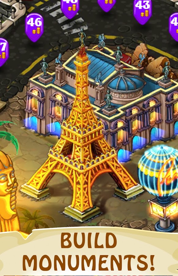 — Путешествие игры 3 в ряд! Города, которые вам предстоит пройти: Остров сокровищ, Токио, Китай, Рим, Египет, Рио, Стамбул, Москва, Дубай, Magic Island и др.