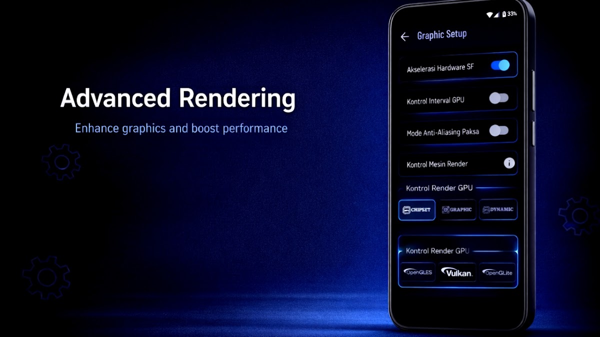* Мастерство графики: найдите свой идеальный визуальный баланс с помощью 5 различных типов рендеринга. Выберите один из 4 мощных графических режимов (высокий, средний, низкий, сверхнизкий), чтобы повысить FPS и устранить задержки, адаптируя производительность к любому устройству или игре.