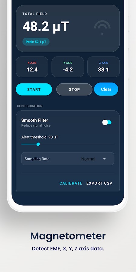 • Настраиваемые оповещения и пороговые значения: установите собственные пределы. Получайте мгновенные уведомления, когда магнитное поле превышает выбранный вами порог. • Профессиональный регистратор данных: записывайте показания датчиков с течением времени. Просматривайте подробные журналы прямо в приложении — идеально подходит для научных экспериментов, диагностики и сравнительного анализа.