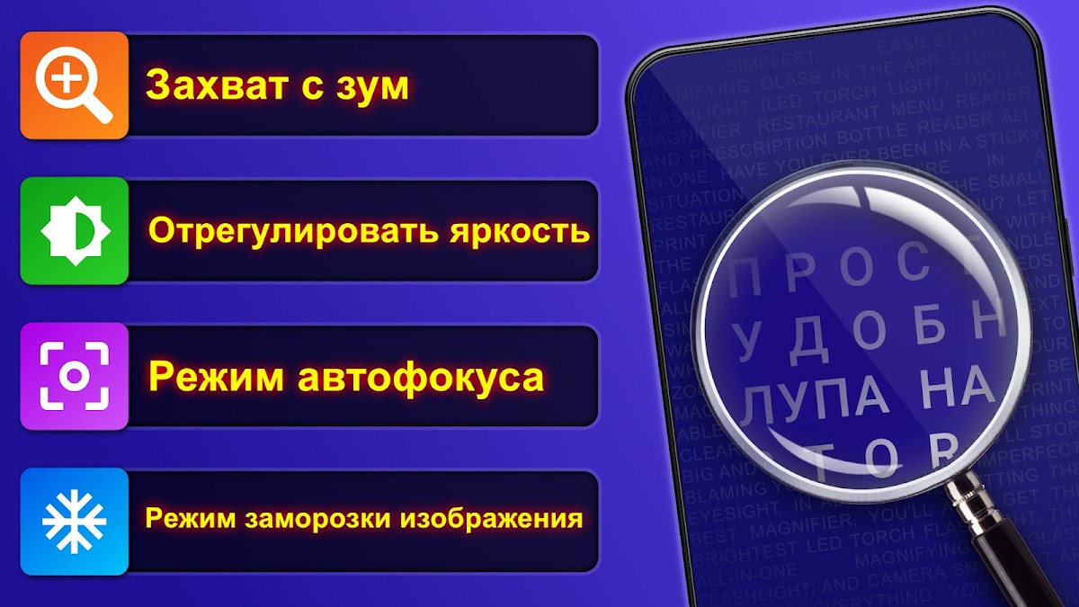 Загрузите на удивление удобное приложение-лупу, чтобы читать самый мелкий шрифт. Теперь читать станет легко и приятно. И что самое важное: вы избавите себя от неудобств из-за ухудшающегося зрения. В дополнение к лучшей лупе вы получите самый яркий фонарик со светодиодом для подсветки.