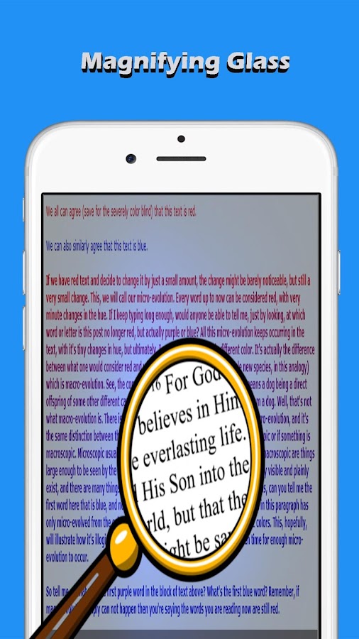Причина разработки этого приложения, чтобы помочь тем, у кого слабые глаза и которым приходится полагаться на других при чтении небольших текстов. С помощью увеличительной камеры вы сможете самостоятельно выполнять свои повседневные дела. Увеличивать масштаб текста или изображения во время выполнения просто и легко.