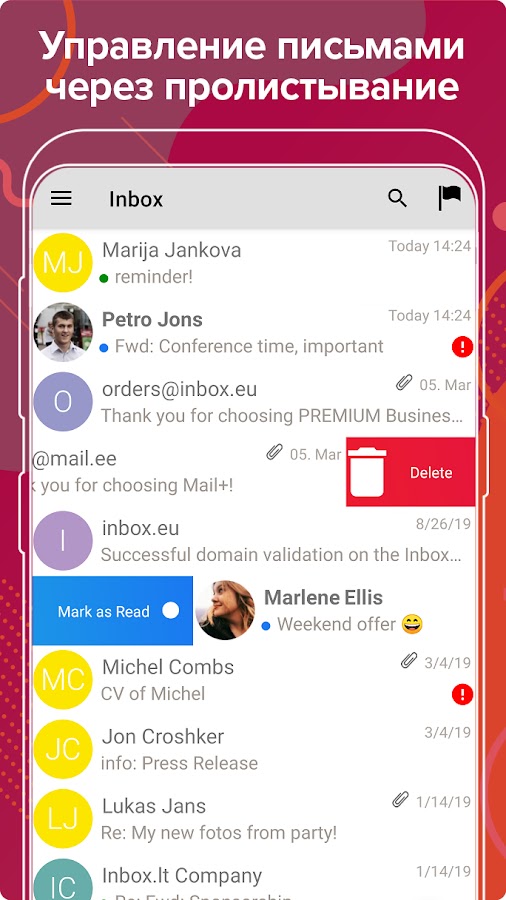 • Жесты прокрутки (swipe) – мгновенное удаление письма или отметить как непрочитанное