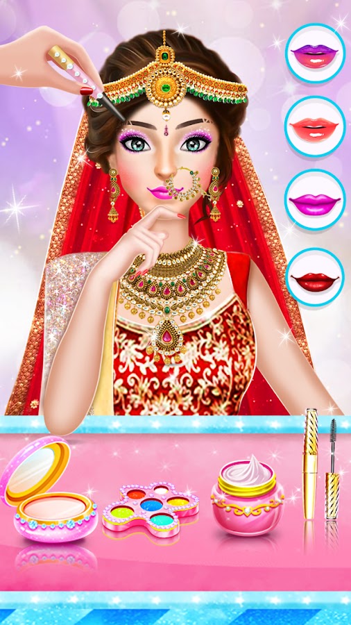 Возьмите Невесту и Groom в спа-салон до их королевской свадьбы. Расслабьтесь их, давая массаж лица в свадебном салоне, лечить в соответствии с обручальными играми. Положите хну уникальных дизайнов на руках королевских индийских невесты и выберите платье своего выбора на день свадьбы. Сделайте невеста красивее, выбирая цвет волос, цвет глаз, цвет тени для глаз, уникальный цвет туши, привлекательная помада цвет, краснеть на цвет, стиль бровей и прическа в индийских свадебных салонах. Используйте косметику и убедитесь, что ваша прекрасная невеста выглядит абсолютно потрясающе в брачных картинках. Дайте своей куклу принцессы светящийся вид и красивая прическа осечника. Сделайте ее выглядеть более потрясающим со многими аксессуарами, такими как кольцо для носа, ожерелье, серьги, каблуки и многое другое в индийской свадебной стильной одежде.
