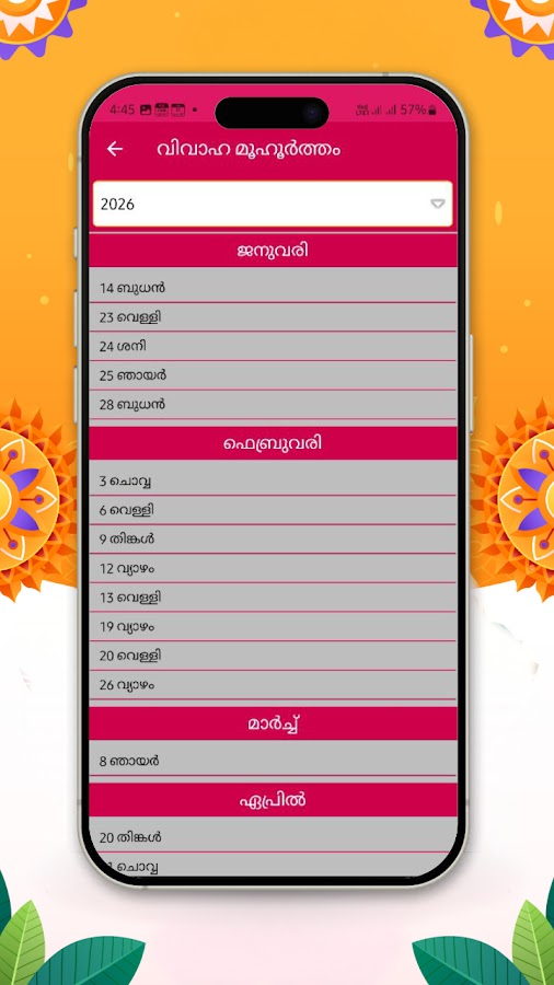 Календарь малаялам на 2026 год с приложением «Календарь малаялам Панчангам на 2026 год» содержит всю необходимую информацию, включая список праздников на 2026 год, список фестивалей, информацию о панчангаме, список дней шубх-мухурат для носителей малаялам.