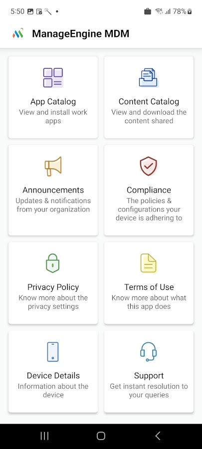 Приложение ManageEngine MDM позволяет быстро зарегистрировать ваши устройства в службе управления мобильными устройствами вашей организации и предоставляет доступ к приложениям и документам вашей компании, внутренним приложениям, пользовательскому каталогу приложений компании, объявлениям ИТ-отдела, удаленной помощи от вашего ИТ-администратора, а также защищает ваши устройства и рабочие данные в соответствии с политиками ИТ-безопасности вашей компании. Это приложение подходит для различных сценариев использования устройств, таких как «используй собственное устройство» (BYOD), киоск, личное использование на устройствах, принадлежащих компании, и выделенные компанией рабочие устройства.