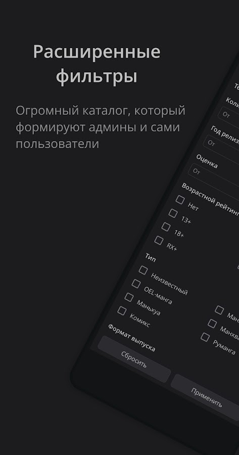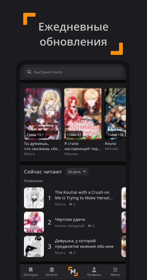 Открывайте для себя новые тайтлы с расширенным поиском в каталоге и легко читайте их в нашем приложении. Скачивайте любые тайтлы и читайте без интернета, в оффлайн режиме