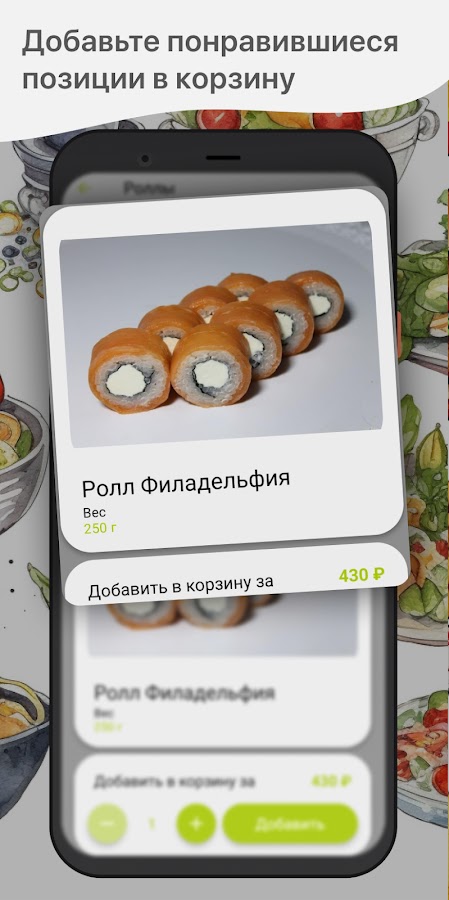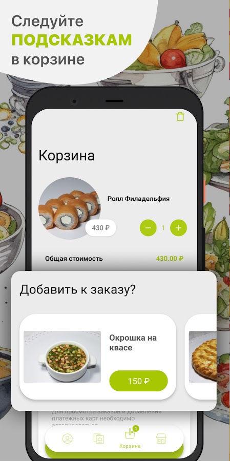 Как сделать заказ в приложении “MANGO”: выберите понравившиеся позиции из меню, добавьте их в корзину и перейдите на экран оформления заказа (по нажатию на иконку корзины).