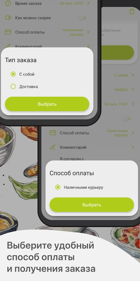 Укажите время, когда хотите прийти за своим заказом или выберите доставку с указанием времени и адреса доставки.