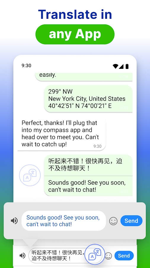 При использовании различных социальных чатов для общения с иностранными друзьями, мгновенно переводит содержимое диалогового окна чата для вас; автоматически переводит текст, который вы получаете на ваш предпочтительный язык и текст, который вы отправляете на их язык, делая общение на иностранном языке проще и быстрее, поддерживая перевод диалогового окна пузырька, перевод поля ввода и перевод текста буфера обмена.