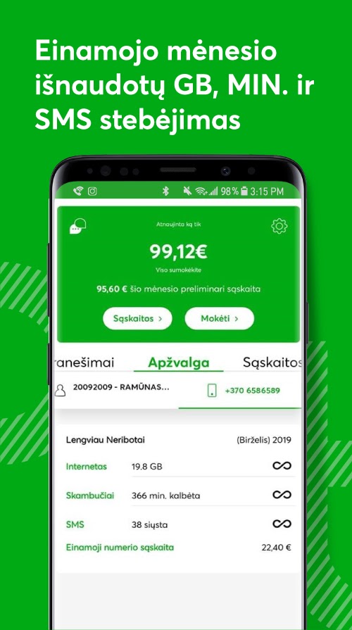 • stebėti kiekvieno jūsų turimo numerio einamojo mėnesio išnaudotus GB, MIN. ir SMS;