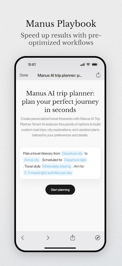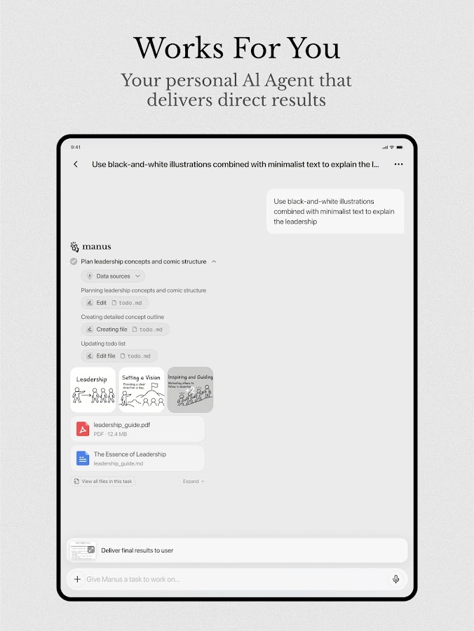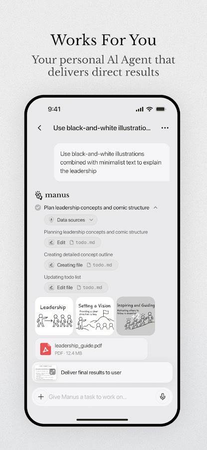 В то время как другие инструменты ИИ останавливаются на мозговом штурме, Манус доводит ваши идеи до реализации. Используя свой собственный «компьютер», Манус разбивает вашу задачу на список дел, выполняет эти подзадачи и предоставляет вам конечный результат.