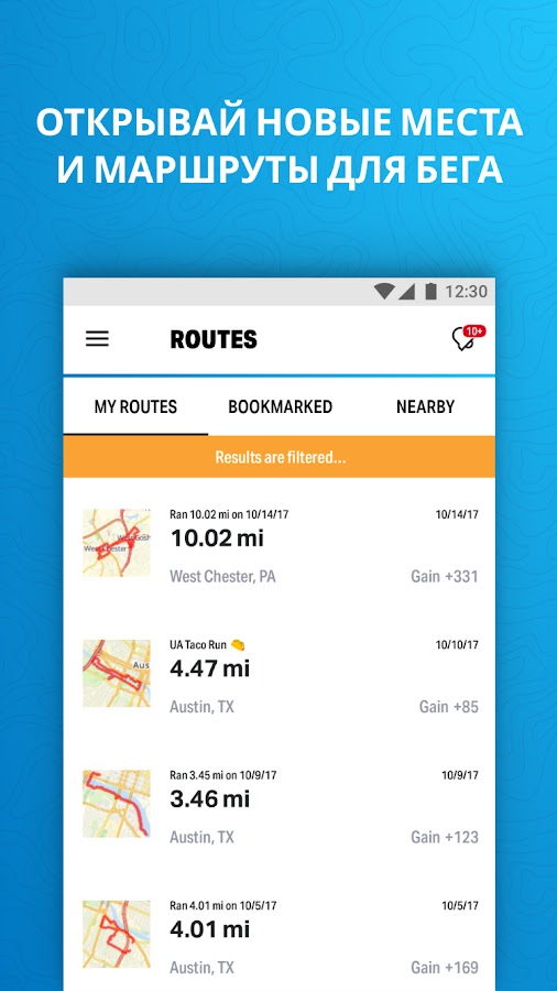 — Используйте функцию маршрутов, чтобы находить места для пробежек поблизости, сохранять любимые маршруты, добавлять новые и делиться ими с другими.