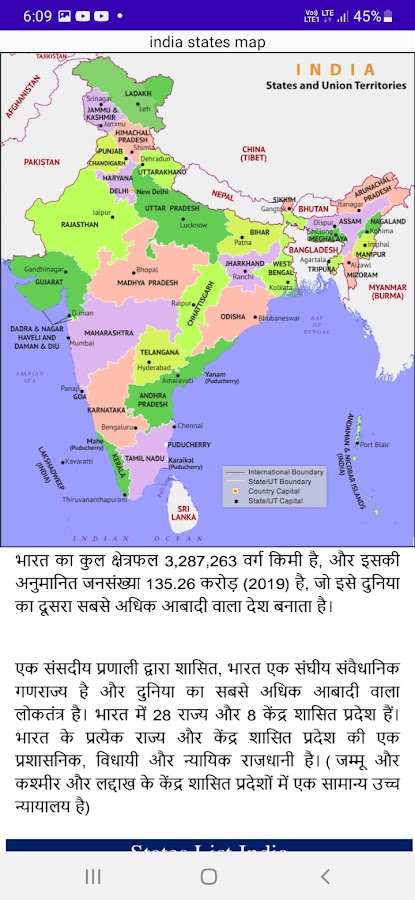 Карта Индии также известна как Бхарат ка манчитра, Индия ка накша. Карта Индии — это совершенно бесплатное приложение во всех странах. Это приложение полезно для каждого конкурсного экзаменационного студента. Пользовательский интерфейс разработан очень просто для лучшего понимания и хорошего пользовательского опыта. Из этого приложения вы можете получить карты и информационные диаграммы.