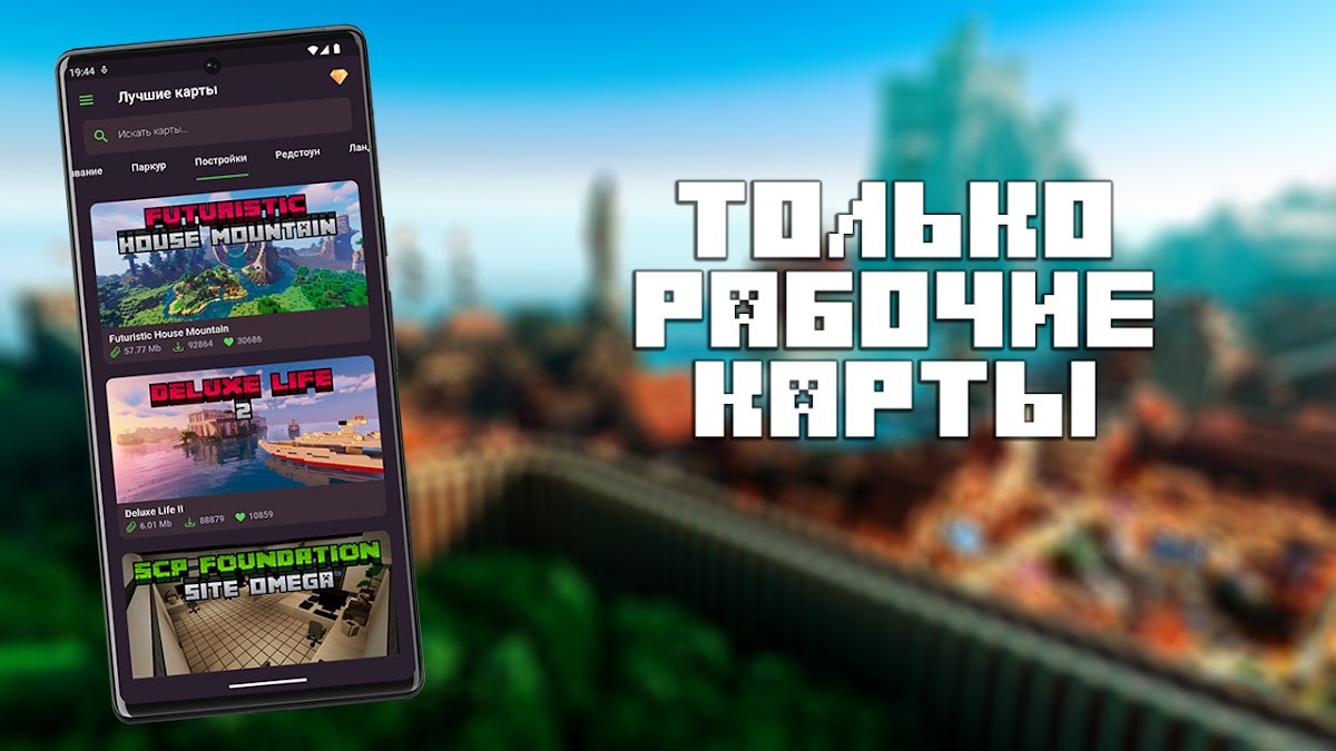 С этим приложением вы сможете найти карту себе по вкусу, начиная с мини игр и скайварс, заканчивая ПВП картами. Оно установит любую карту в ваш Minecraft PE всего в 1 касание. Начните путешествие в неизведанные миры!
