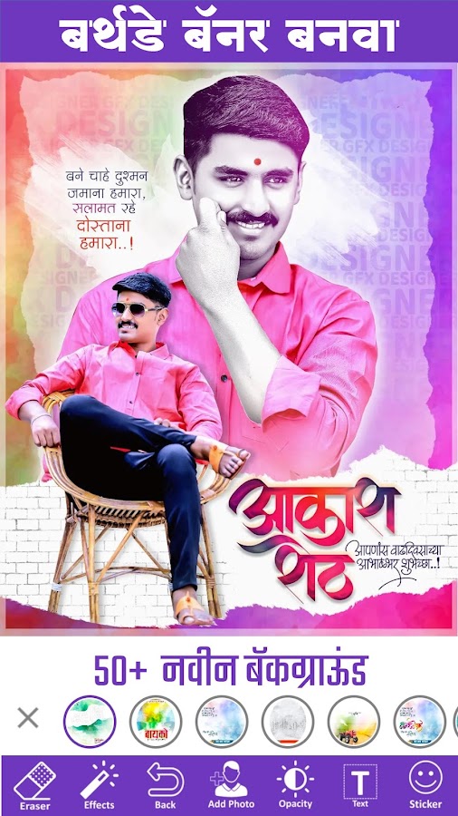 Если у вас есть фотография в формате jpeg и вы хотите сделать фотографию дня рождения, удалив ее фон, вы можете использовать изображение с опцией ластика, указанной в приложении для создания баннеров маратхи. Вы можете разместить столько фотографий на баннере дня рождения, сколько хотите, из галереи своего телефона. Также вы можете сделать баннер дня рождения маратхи привлекательным, увеличив непрозрачность или яркость фотографии дня рождения.