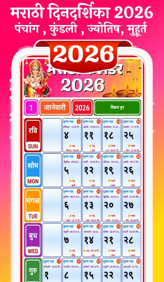 — лучший календарь маратхи на 2026 год: календарь на все месяцы на 2026 год, मराठी कॅलेंडर 2026
