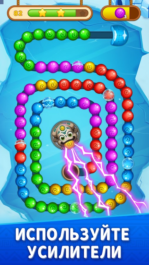 ★ Нажмите на экран, чтобы точно прицелиться и стрелять шарами из вашего каменного идола-лягушки. ★ Соединяйте и взрывайте не менее 3 шаров одного цвета, чтобы лопать пузыри, очищая цепь шаров до того, как она достигнет золотого черепа.