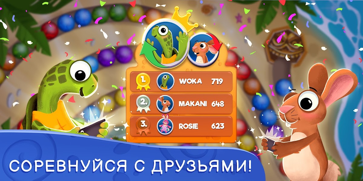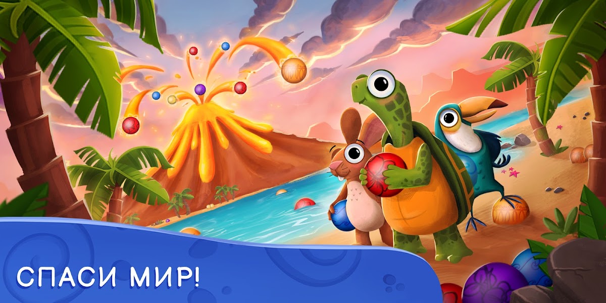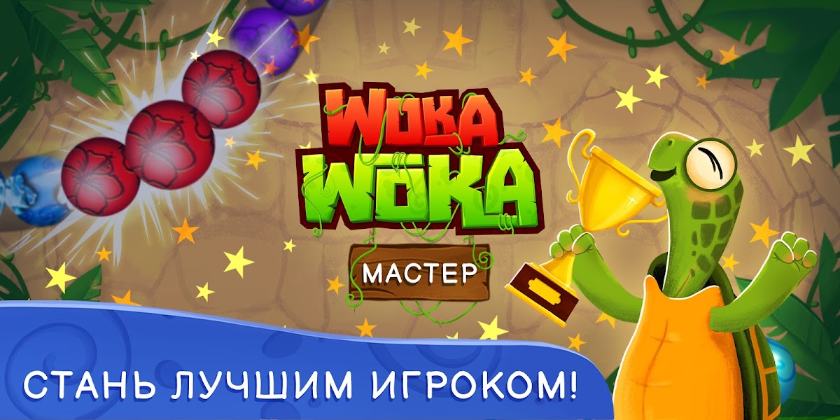 — Мир дружелюбных персонажей и наша черепаха Woka проведут тебя через шариковые джунгли.