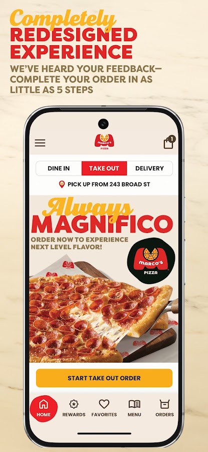 Настройте пиццу по своему вкусу, воспользуйтесь скидкой или повторите заказ любимого блюда — приложение Marco’s предоставит вам всё меню — меньше нажатий, улучшенное отслеживание и больше бонусов.