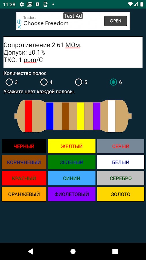 Декодер цветовой маркировки резисторов — это удобный инструмент для электронщиков, дающий возможность быстро определить значение любого резистора. Просто выберите цвета соответствующие полоскам резистора на вашем экране и приложение рассчитает его значение. Также есть возможность выбрать стандартные значения резисторов и увидеть соответствующие им цвета. Это приложение простое в использовании, интуитивно понятное и оснащено красочным интерфейсом. Оно будет полезно как опытным электронщикам, так и начинающим. Скачивайте наше приложение, и удобно работайте с резисторами.