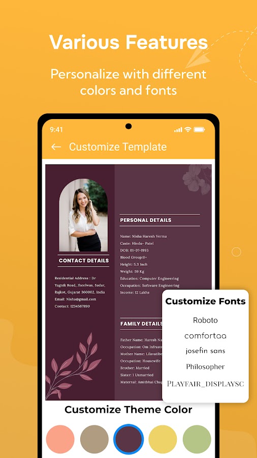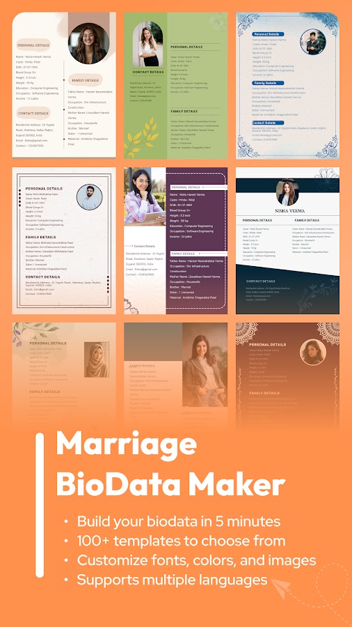 Marriage Bio Data Maker вы можете сделать ваши биологические данные для брака в считанные минуты. Просто заполните свои основные данные, и ваши биологические данные готовы, вы можете распечатать и использовать их в любом месте.