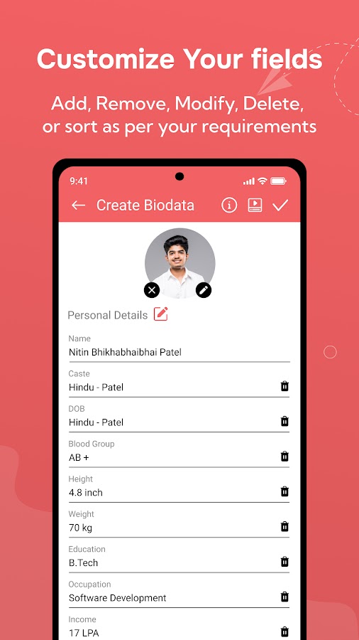 Это приложение может быть идеальным приложением для поиска вашего партнера, создавая потрясающие биологические данные. Вы можете рекомендовать и предлагать это приложение своим друзьям и родственникам, чтобы они также могли создавать для них лучшие биоданные.