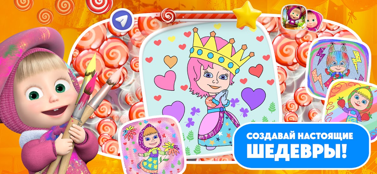 «Маша и Медведь Раскраска» — это творческое приложение для раскрашивания для детей с более чем 100 бесплатными рисунками. Все изображения открыты сразу — абсолютно бесплатно, без скрытых покупок и подписок.