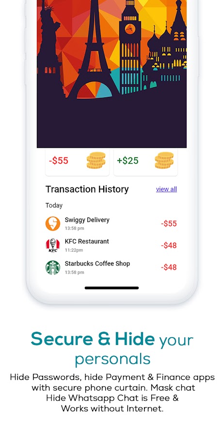 Скрыть пароли, скрыть платежи и финансы приложений с помощью безопасного телефона занавес.