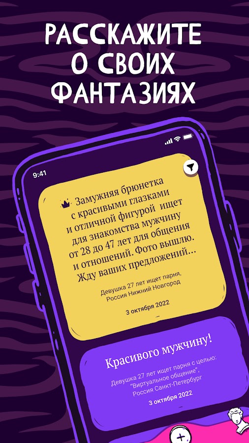 Каждый пользователь может разместить собственное бесплатное объявление и ответить на другие. Здесь можно и нужно писать не спеша, наслаждаясь искренним общением, и решать — раскрывать свою личность или продолжать общение под маской до конца вечера.