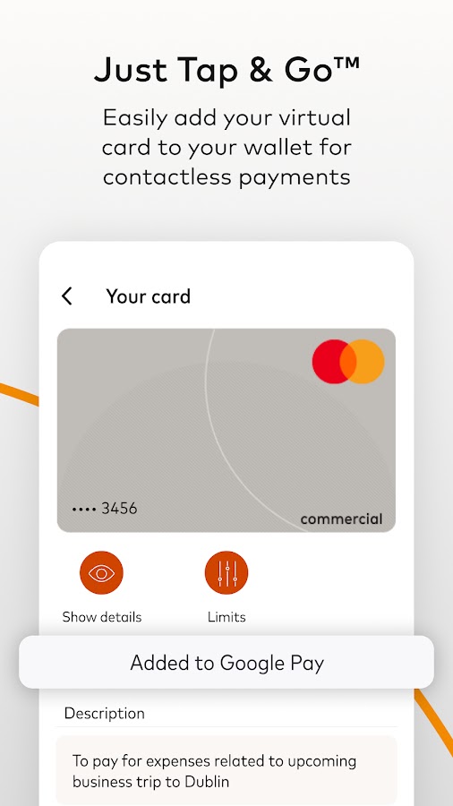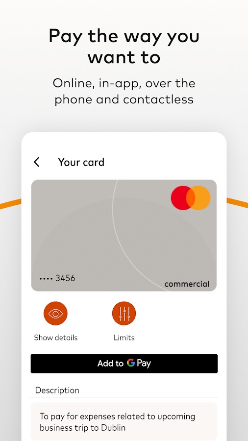 Mastercard In Control™ Pay позволяет пользователям легко управлять своими мобильными виртуальными коммерческими картами. Пользователи могут легко добавлять карты в свои цифровые кошельки и получать безопасные платежи онлайн, в приложениях, по телефону и бесконтактные платежи. С помощью In Control Pay организации могут упростить и улучшить оплату командировочных расходов (T&E) и B2B как для сотрудников, так и для лиц, не являющихся сотрудниками.