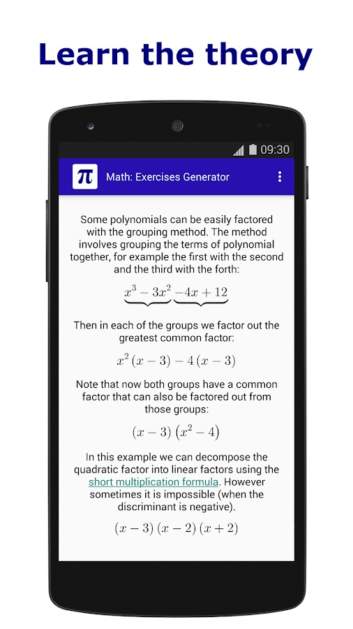 Приложение Математика: Генератор задач генерирует случайные упражнения для заданного предмета, давая результат и полное решение для каждой. Он также включает краткое введение (учебник) по каждой теме. Изучение математики на уровне среднего (полного) общего образования: средняя школа, лицей, гимназия, бакалавриата.