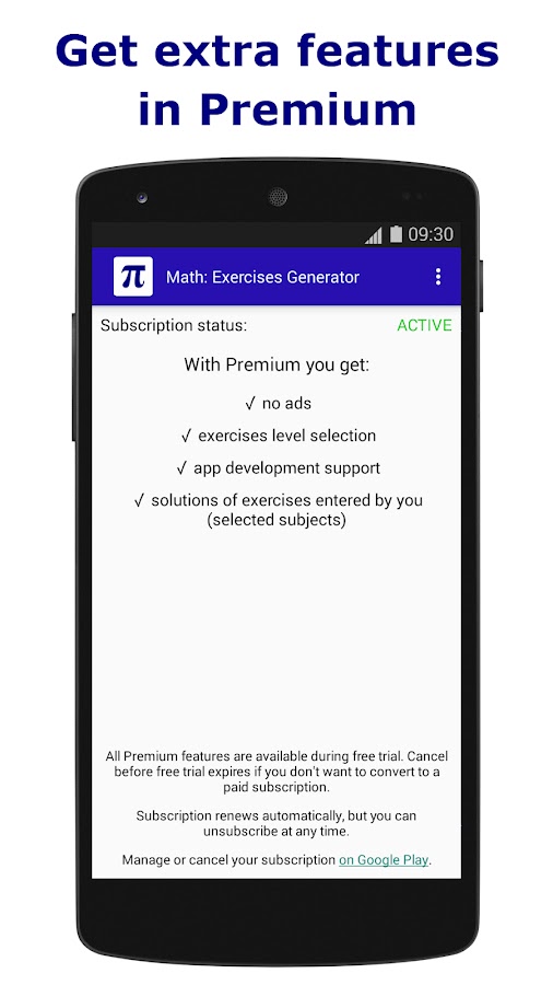 Активируйте Premium, чтобы выбрать уровень упражнений, отключить рекламу и позволить приложению решать неограниченное количество ваших упражнений (выбранные темы).