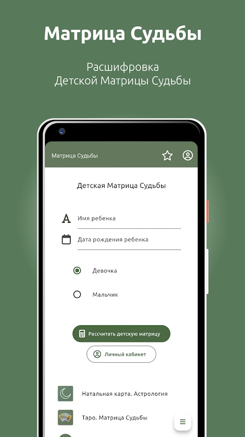 Детская матрица судьбы предназначена для тех, кто хочет раскрыть потенциал своих детей и помочь им правильно выбрать свое место в жизни. Для получения детской матрицы судьбы приложение запрашивает данные о дате рождения ребенка. После этого приложение производит расчеты и выводит готовую матрицу судьбы ребенка, указывая на его жизненные направления и потенциальные препятствия.