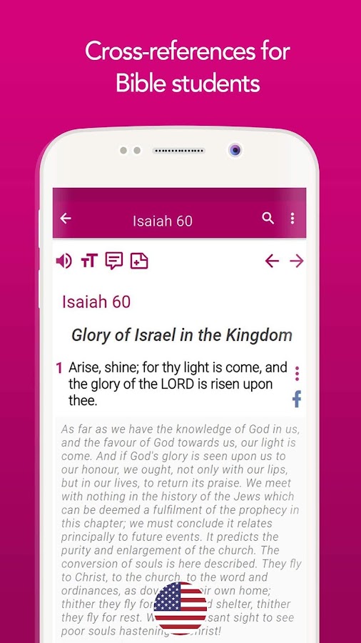 Это приложение для изучения дает вам множество ресурсов, которые помогут вам читать и понимать Библию. Благодаря версии короля Якова (KJV) у вас есть бесплатный доступ к комментариям Мэтью Генри к Библии. Мэтью Генри был автором, писателем и министром, родившимся в Уэльсе, Соединенное Королевство.