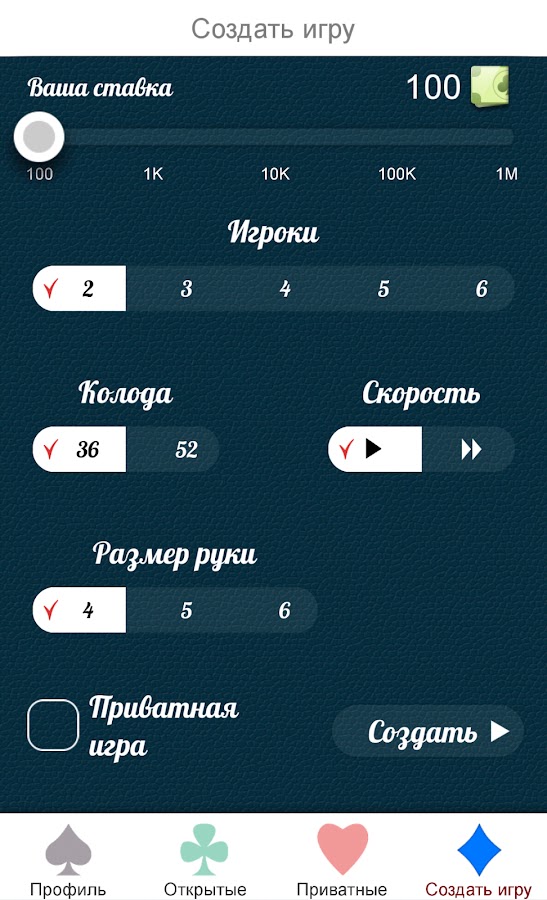 1. Настройка количества игроков. Доступны игры по сети из 2-6 человек. Вы сами выбираете сколько людей будет играть в карты с Вами.