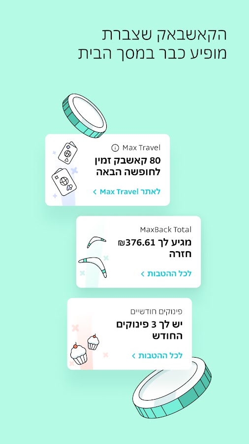 Чуть ниже мы покажем вам кредиты и страховки от max, а затем покажем вам все угощения, баллы и возмещения, которые вы накопили по различным картам. В промежутках мы предлагаем вам новые продукты, преимущества и действия, которые стоит открыть для себя — будьте открыты для новых идей, это всегда хорошо.