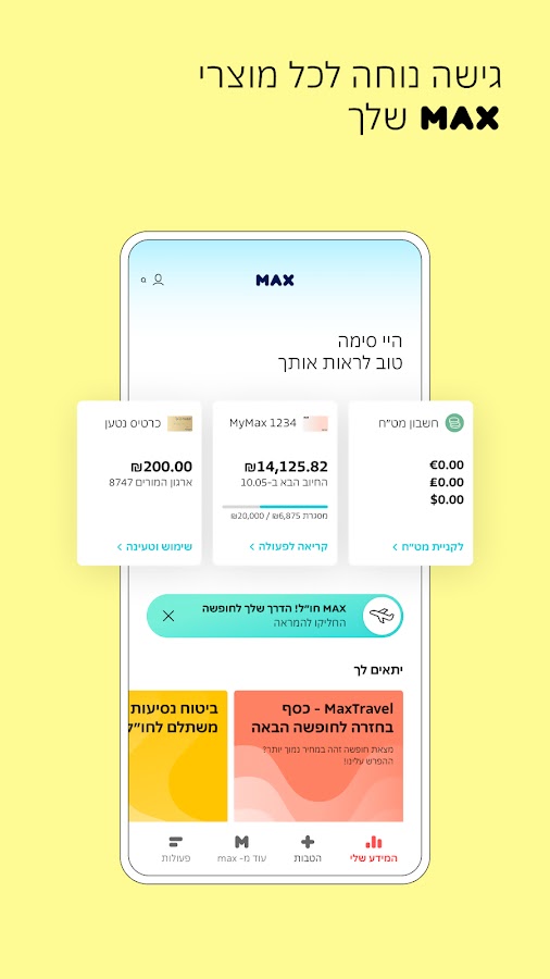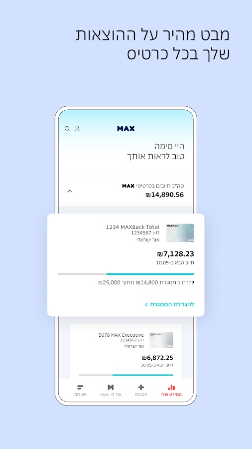 — Операции по карте — история говорит нам о том, что люди звонили на горячую линию службы, чтобы сообщить об утере или краже карты, попросить перенести кадр с одной карты на другую, изменить дату выставления счета и отправить постоянные поручения. Как здорово, что нас больше нет и сегодня вы можете выполнять все эти действия и многое другое 24/7 дистанционно через наше приложение. Итак, если вы хотите просмотреть секретный код карты, заблокировать возможность совершения телефонных или интернет-транзакций в Израиле или за границей, конвертировать баллы maxback, проверить баланс фрейма или внести предоплату, перейдите на вкладку операции, все ждет вас там.